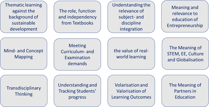 The intensive interactive training includes amongst others the Teachers' familiarity with Culture, the world of Work, contemporary Scientific insights, social developments as well as local and global trends related to sustainable development. Their pedagogical and didactic knowledge and experience is taken for granted, however, continuously addressed and assessed.